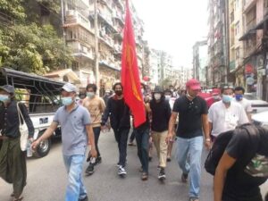အလုပ်သမား ရာနဲ့ချီ၊ ထောင်နဲ့ချီပါဝင်တဲ့ အလုပ်သမားသပိတ်တွေကလည်း လှိုင်သာယာ၊ရွှေပြည်သာ၊ဒဂုံဆိပ်ကမ်း၊ အရှေ့ဒဂုံ၊ လှည်းကူး၊မြောင်းတကာ၊ပဲခူးနေရာအနှံ့ပါပဲ။ ကျနော်နဲ့ ကိုဟိန်းဇင်၊အခု PLA ရဲဘော်ကိုခန့်ကျော်ထက်တို့က အဲ့ အာဏာမသိမ်းမှီ လပိုင်းအချိန်မှာ ဝရမ်းထုတ်ခံထားရပြီး ပဲခူးဘက်ခြမ်းနဲ့ မဂ်လာဒုံ၊လှည်းကူးဘက်က အလုပ်သမားထောင်ကျော်သပိတ်တွေမှာ ရုပ်ဖျက်ပြီး သွား စည်းရုံးနေချိန်ပါ။ PLA ထဲ အများစုရောက်နေကြတဲ့ ကိုအဲမွန်၊ကိုမိုးဝေ၊ကိုစံရှား တို့က မြောင်းတကာဘက်က ကျူးကျော်တဲတွေက လုပ်သားတွေကိုစုစည်းပြီး လေတပ်ပိုင်နယ်မြေထဲ ရွာသစ်ဖော်ပြီး မြေတွေ အခမဲ့ဝေခြမ်းပေးနေကြတာပါ။